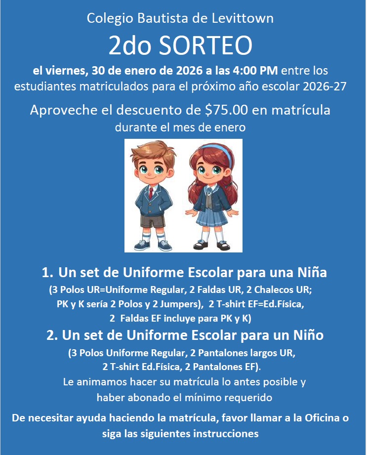 3er Sorteo entre todos los matriculados que hayan abonado $500.00 o más para la Matrícula (1ro-12mo Grado) o hayan pagado la totalidad de la Matricula (PK-Kinder) para el 27 de febrero de 2026